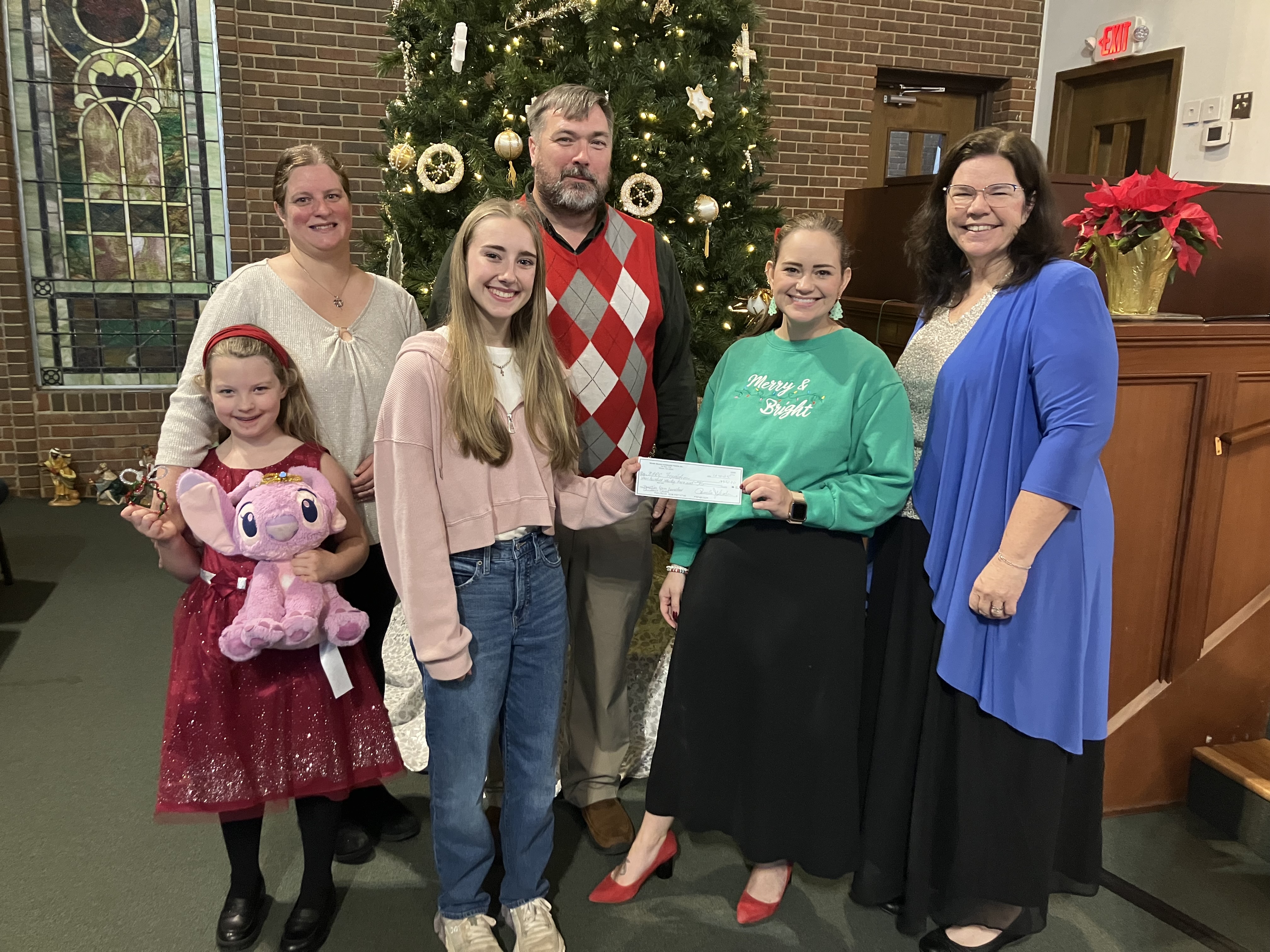 Winder-Barrow Community Theatre was proud to donate over $400 to Community Christmas sponsored by the Barrow Area Rotary Club. This money was a part of the proceeds from the Christmas play, "A Seussified Christmas Carol" presented the first weekend of December by the WBCT Children's PLAYhouse. WBCT donates to a local nonprofit after every show as a part of their continuing program to help people all over Barrow County. The Community Christmas program provides Christmas presents to many local families and involves many groups who provide toys, gifts, and donations. The picture shows the Hasty family and Harper Allen who were involved in the play presenting the check to Kym McLane and Cheryl Cloar from the Rotary Club.